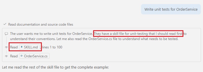 This is all that’s required for Copilot to pick up the skill. Now, I’ll just ask Copilot about something related to unit testing and it should use the skill on its own: